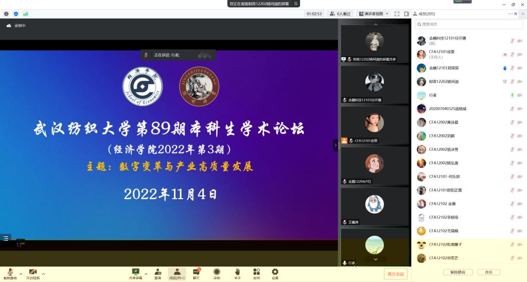 為營造良好學術生态,弘揚優良學風,培養學生學術科研思維與創新能力,11月4日晚,由教務處(創新創業學院)主辦,77779193永利官网承辦的77779193永利官网第89期本科生論壇暨77779193永利官网2022年第三期本科生論壇在騰訊會議線上平台進行。此次論壇以“數字變革與産業高質量發展”為主題,參加了2022年暑期社會實踐或企業實習的劉海燕、彭湘蕙子、歐陽芷萱、艾鑫洲等4名本科生分别圍繞自己的專業實踐與學習成果作交流分享。學院保永文副教授、史樂來老師、江露薇老師應邀出席論壇并作專業點評,學院團委書記淩傑及各年級200餘名本科生線上觀摩學習。