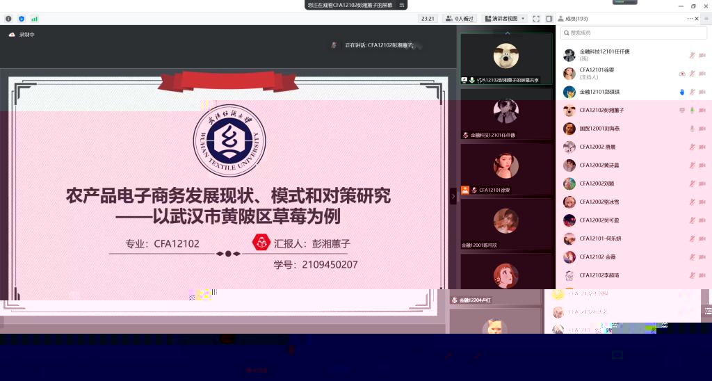 CFA12102班彭湘蕙子以《農産品電子商務發展現狀、模式和對策研究——以武漢市黃陂區草莓為例》為題,梳理了對黃陂區草莓産業的調研過程及其成果,認為當前草莓産業仍存在深加工程度不高、供應鍊建設不完全等問題,基于對全國農産品電子商務發展現狀與主要模式進行綜合對比分析提出了個性化多矩陣電商助農的發展策略。