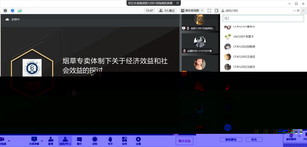 國貿12001班劉海燕以《煙草專賣體制下關于經濟效益和社會效益的探讨——基于襄陽市樊城區煙草專賣局的調查研究》為題,分享了項目團隊赴襄陽市調研煙草産業的研究成果,從效益角度分析提出産業發展要基于平衡視角,既立足社會、服務群衆又注重收益、兼顧業績,實現價值依歸。