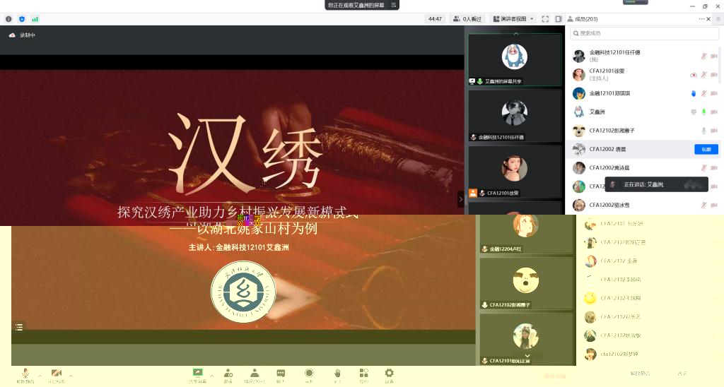 金融科技12101班艾鑫洲以《探究漢繡産業助力鄉村振興發展新模式——以湖北姚家山村為例》為題,分析了姚家山村漢繡産業發展面臨的困境以及發展優勢,展示了團隊在暑期實踐中幫助姚家山村創作的系列成果,指出為鄉村謀出路、謀發展是新時代的“三農”工作突出主題,探索将非遺與鄉村振興相結合,構建以非物質文化遺産為載體的鄉村振興新模式。